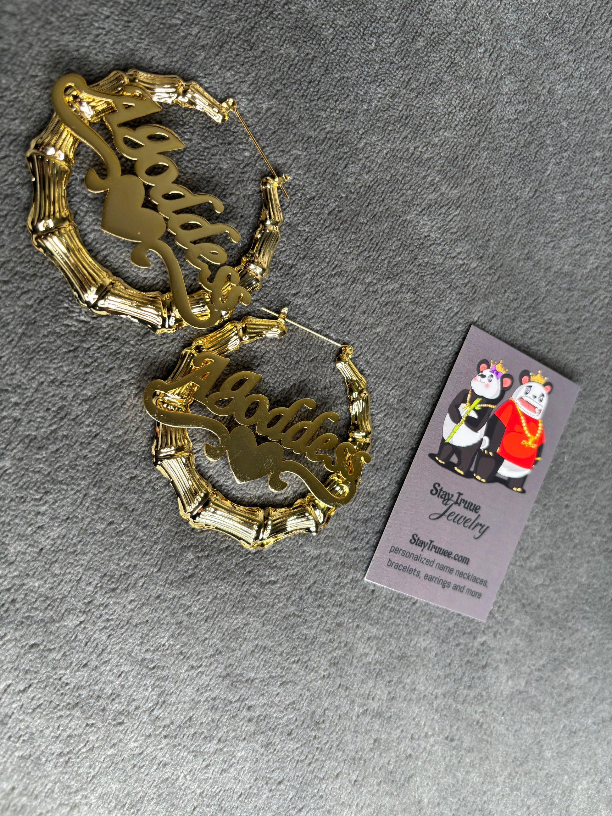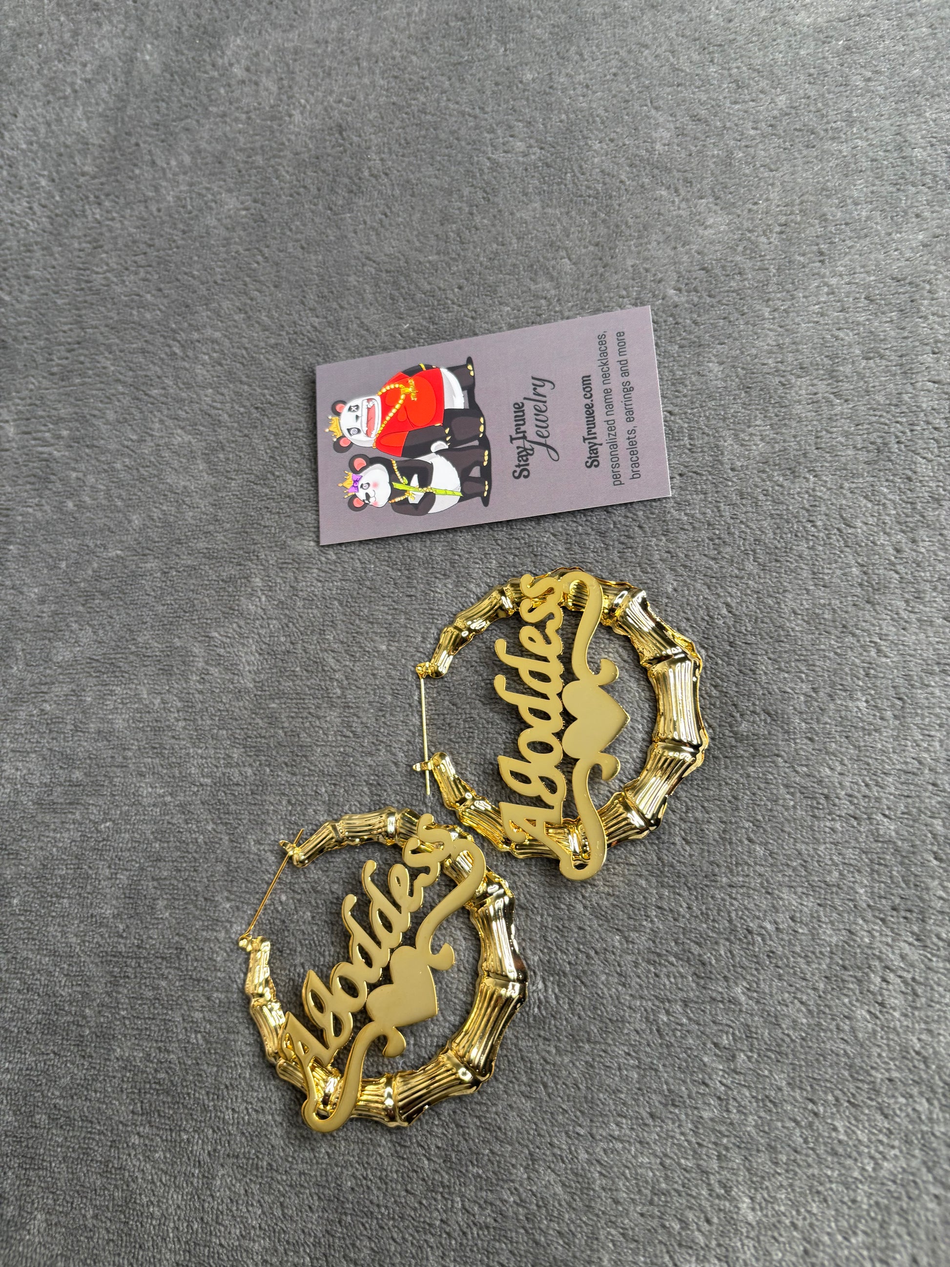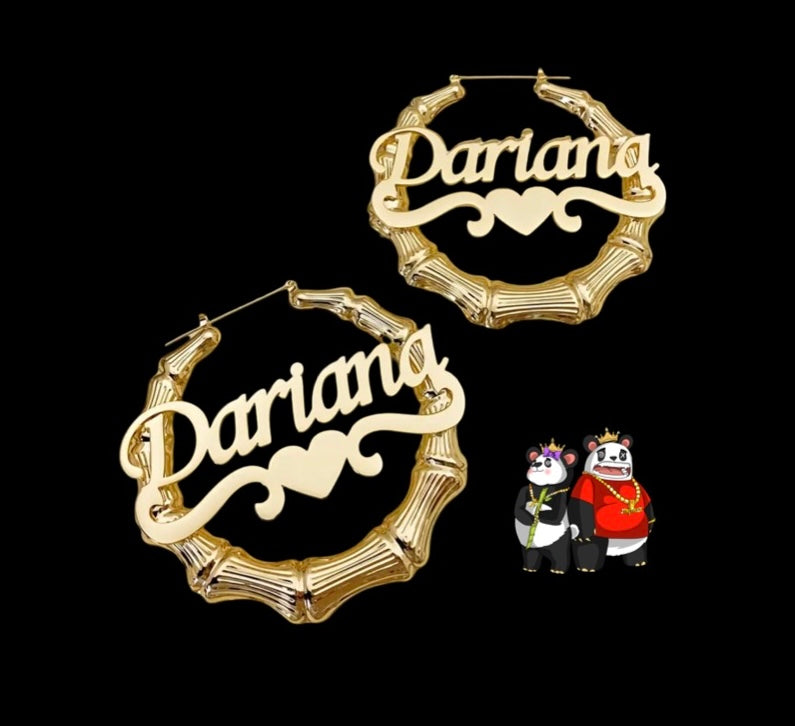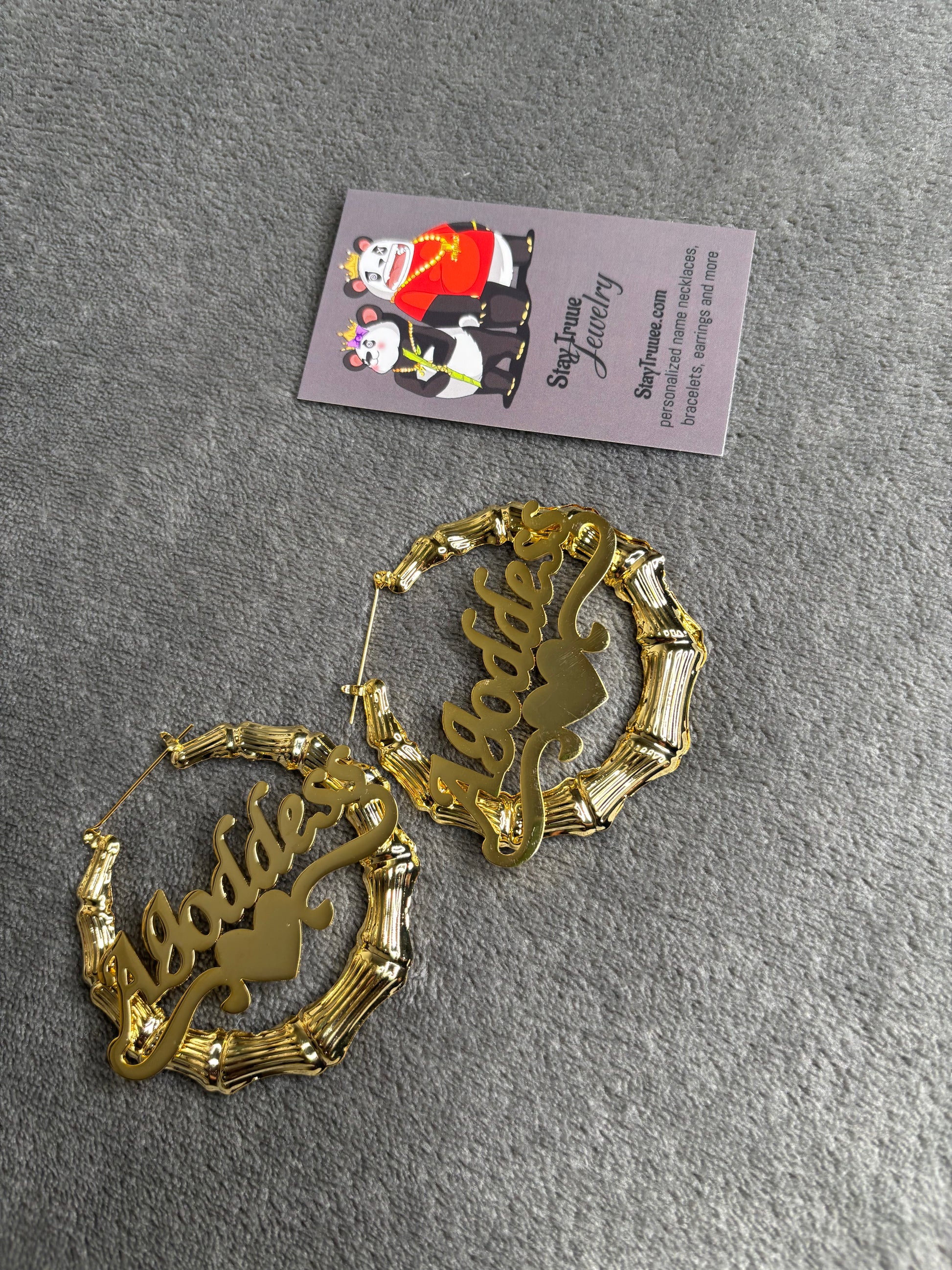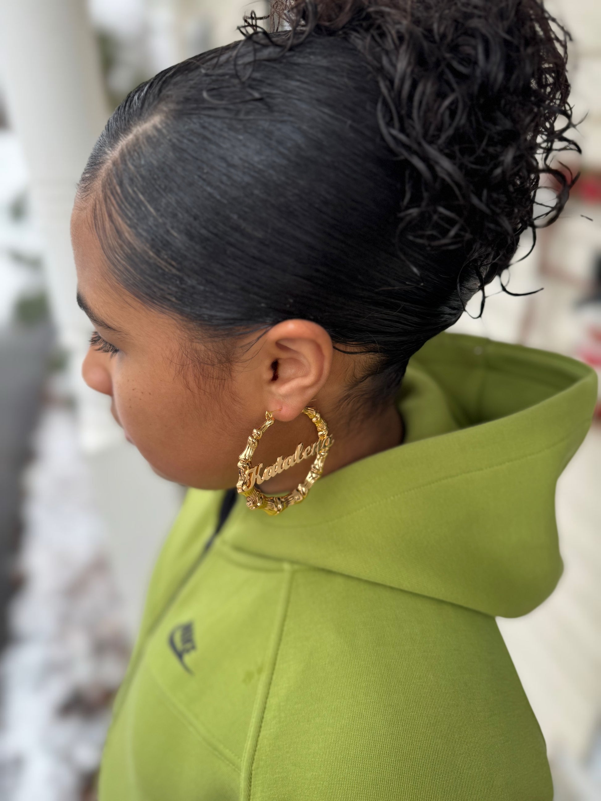 Classic. Bold. Unapologetic. These custom bamboo hoops are the ultimate throwback with a personalized twist. Your name (or word of choice) takes center stage inside a gold bamboo-style frame—giving major main character energy.