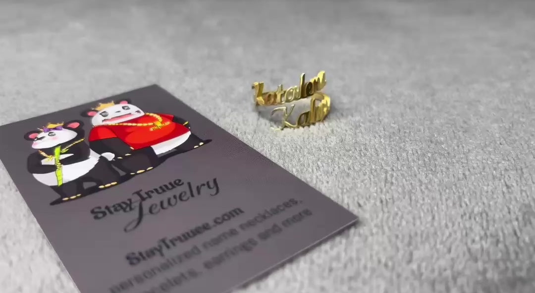 Elegant, meaningful, and uniquely yours. This custom bypass-style ring wraps two names into one timeless design—perfect for celebrating love, family, or self-expression. The open band creates a modern silhouette with a personal twist.