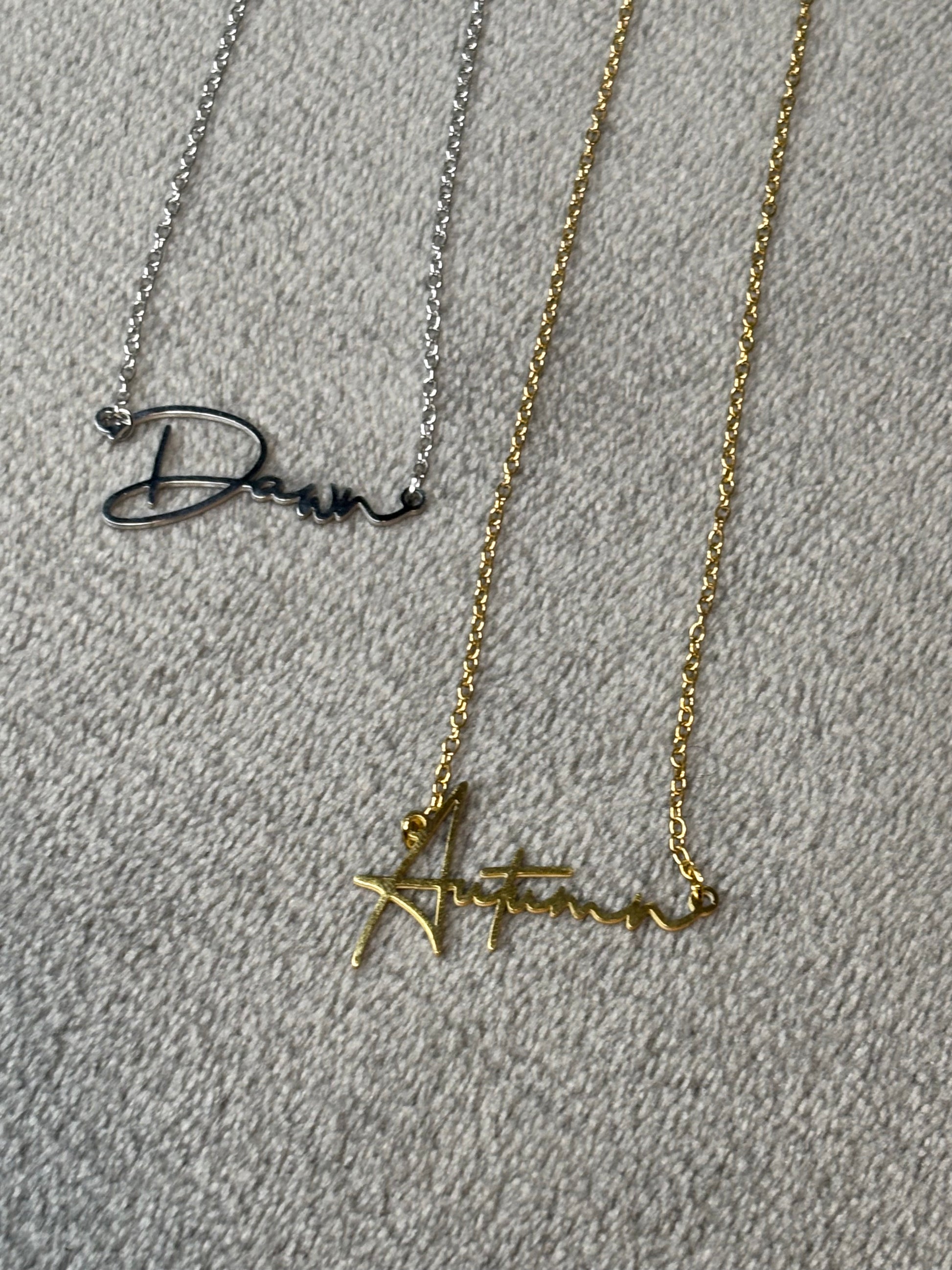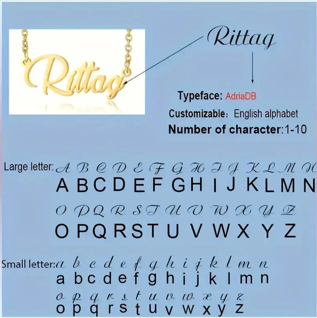 - Custom name necklace (1–10 letters)